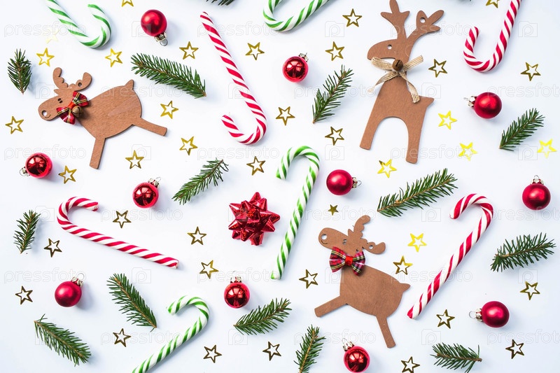 Новогодний фон 2021. Различные праздничные предметы, в том числе рождественские олени, леденцы и игрушки. Рождественская концепция
