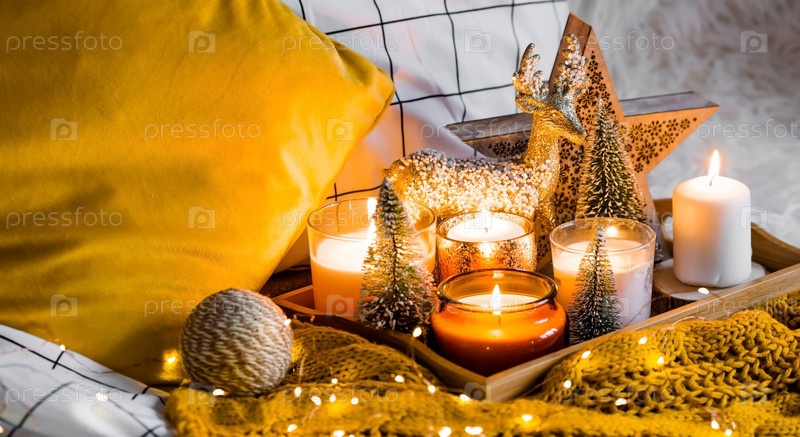 Зажженные свечи и рождественские украшения на деревянном подносе с теплым пледом. Зимний уютный стиль. Концепция хюгге