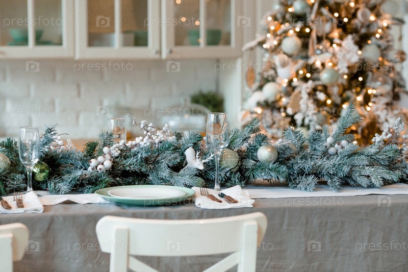 Красивый нарядно оформленный стол к новогоднему празднику. бокалы для шампанского, тарелки, еловые ветки, крупный план. Концепция бронирования кафе и ресторанов на праздники