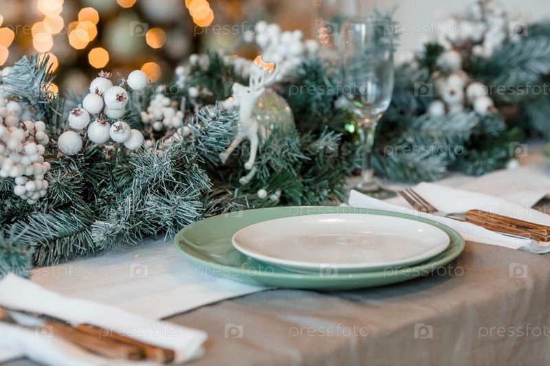 Красивый нарядно оформленный стол к новогоднему празднику. бокалы для шампанского, тарелки, еловые ветки, крупный план. Концепция бронирования кафе и ресторанов на праздники