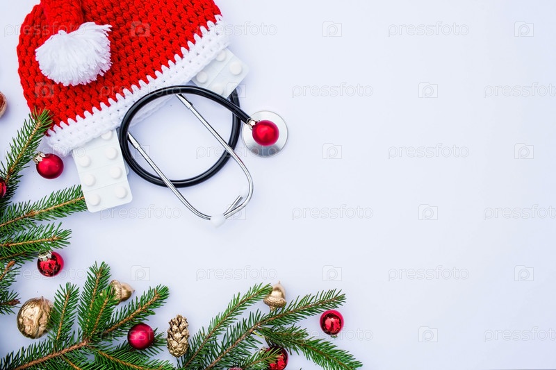 Медицинский баннер 2023 года для клиник с таблетками, стетоскопом и рождественской елкой на белом фоне. Копипространство. Медицина новый год плоский