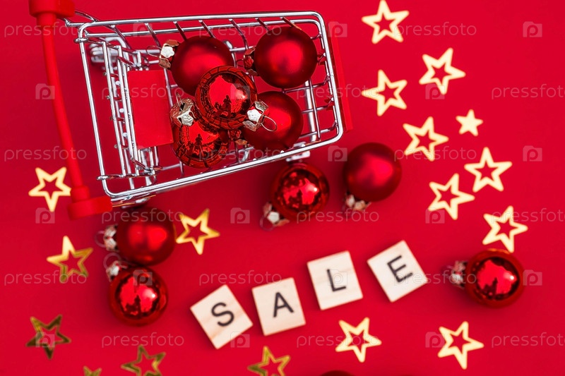 Продуктовая корзина с красными воздушными шарами и буквами. Надпись на английском языке: «распродажа». Рождественские интернет-магазины. Зимние праздничные распродажи, сезонные распродажи, Черная пятница, Рождество, скидки и покупки на месте