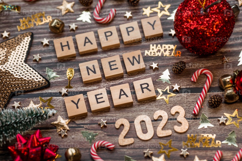 Баннер. Символ числа 2023 с золотыми и красными шарами, звездами, блестками и елкой на деревянном фоне. Концепция празднования Нового 2023 года и Рождества