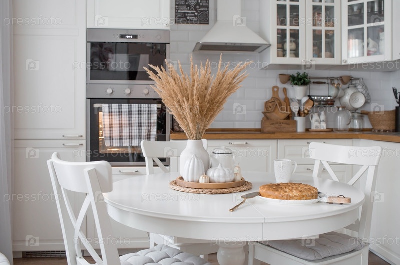 Натюрморт. Сушеная пампасная трава в вазе, белые керамические тыквы, свечи и шарлотка из яблочного пирога на белом столе в интерьере домашней кухни в скандинавском стиле. Уютная осенняя концепция