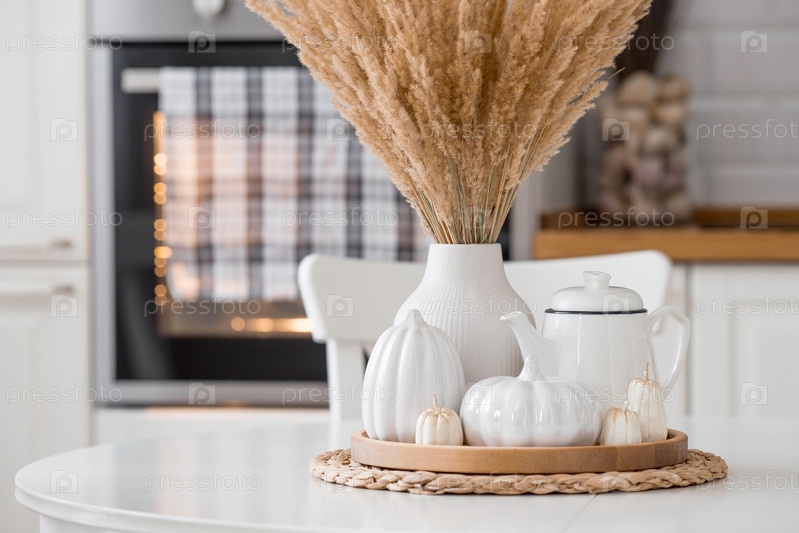 Натюрморт. Сушеная пампасная трава в вазе, белые керамические тыквы, чайник и свечи в форме тыквы на белом столе в интерьере домашней кухни в скандинавском стиле. Уютная осенняя концепция