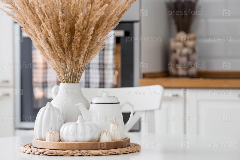 Натюрморт. Сушеная пампасная трава в вазе, белые керамические тыквы, чайник и свечи в форме тыквы на белом столе в интерьере домашней кухни в скандинавском стиле. Уютная осенняя концепция