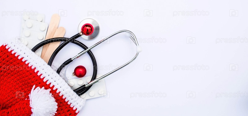 Медицинский баннер 2023 года для клиник с таблетками, стетоскопом и рождественской елкой на белом фоне. Копипространство. Медицина новый год плоский