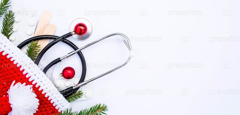 Медицинский баннер 2023 года для клиник с таблетками, стетоскопом и рождественской елкой на белом фоне. Копипространство. Медицина новый год плоский