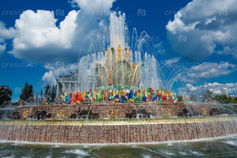 МОСКВА, РОССИЯ. Фонтан Каменный цветок и Павильон Украины на фоне голубого неба и облаков панорамный вид, летний солнечный день, Выставка достижений народного хозяйства ВДНХ