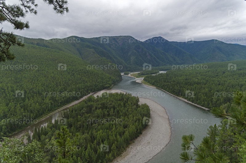 Вид с прибрежной скалы на долину реки Ока Саянская. Восточный Саян, Бурятия, Сибирь, Россия