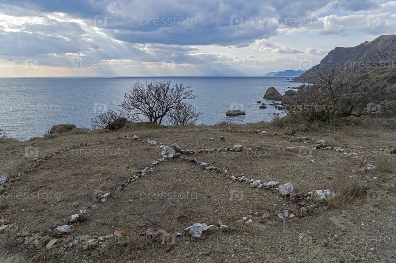 Международный символ мира (пацифик), выложенный камнями на берегу Черного моря. Мыс Меганом, Крым, облачный день в середине сентября