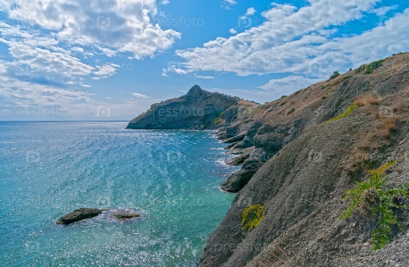 Вид на мыс Капчик с тропы Голицына. Новый Свет, Крым, солнечный день в сентябре