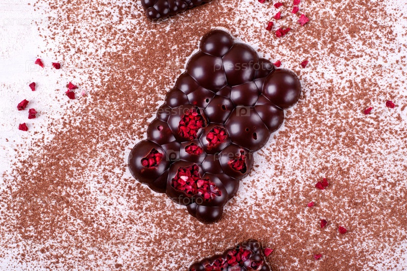 Шоколадный батончик Bubbles с сублимированными ягодами на столе с какао-порошком.Плоская плитка с кондитерскими изделиями ручной работы