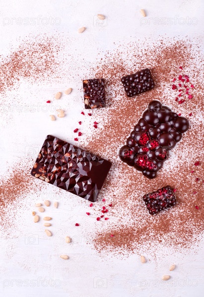 Шоколадные батончики разных размеров и форм с сублимированными ягодами и кедровыми орешками на белом столе с какао-порошком. Плоская кладка с кондитерскими изделиями