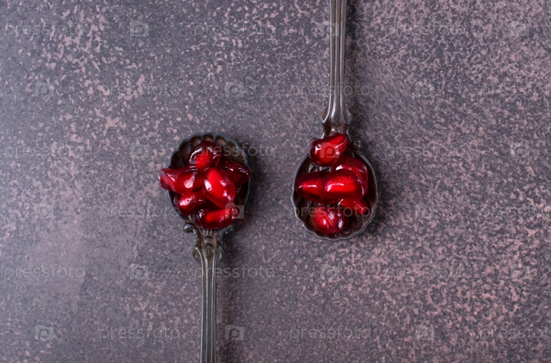 Семена граната в чайных ложках на темно-сером фоне. Вид сверху