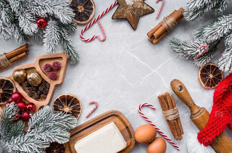 С Новым 2023 годом. Баннер с кухонной утварью, рождественскими украшениями, корицей, пряниками и елью на мраморном фоне. Поздравительная открытка на Рождество. Концепция кафе и ресторанов