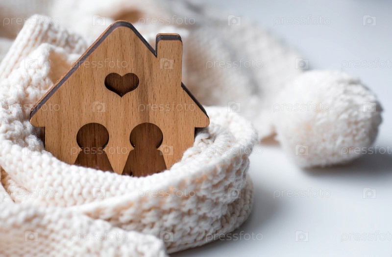 Дом, закутанный в шарф. Зима. Утепление дома, защита от холода и непогоды, система отопления помещений. Энергетический кризис в Европе. Праздничное настроение, Рождество, Новый год 2023