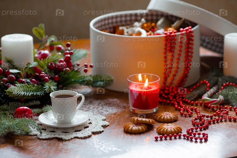 Баннер. Современный рождественский декор в красивых пастельных тонах. Деревянные игрушки и гирлянда на елку