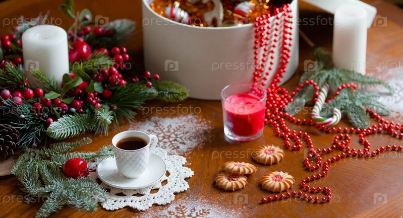 Баннер. Рождественское утро 2023 года в традиционных красных тонах. Новогодние игрушки, кофе и красивые украшения на деревянном столе