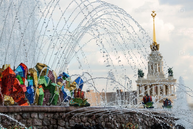 МОСКВА, РОССИЯ. Фонтан Каменный цветок и Павильон Украины на фоне голубого неба и облаков панорамный вид, летний солнечный день, Выставка достижений народного хозяйства ВДНХ