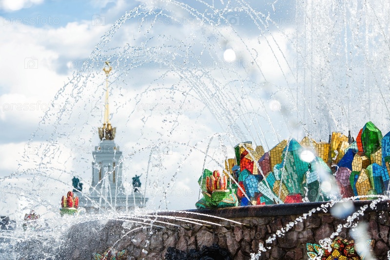 МОСКВА, РОССИЯ. Фонтан Каменный цветок и Павильон Украины на фоне голубого неба и облаков панорамный вид, летний солнечный день, Выставка достижений народного хозяйства ВДНХ