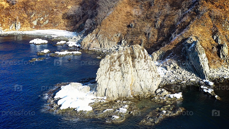 Вид с воздуха на скалистый берег зимой