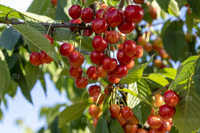 Ветки с плодами красной вишни на фоне голубого неба