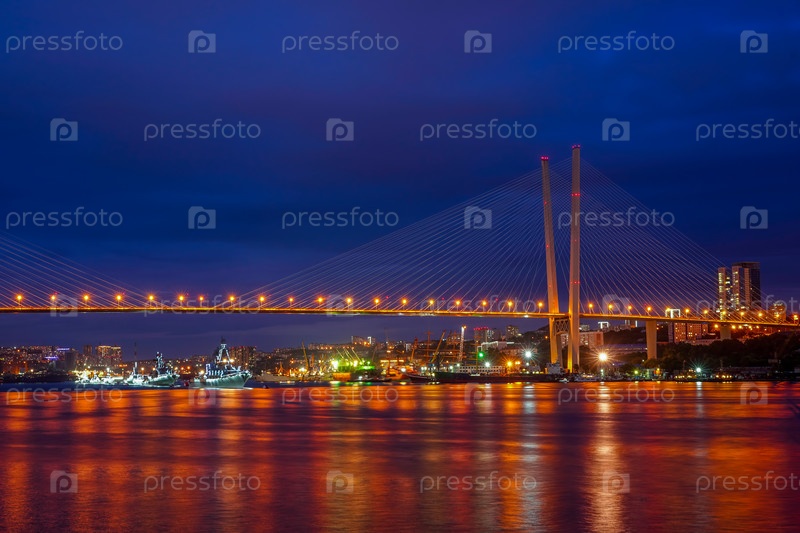 Владивосток, Россия. Городской пейзаж с видом на Золотой мост