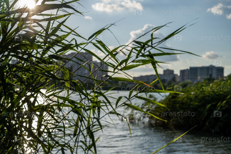 Пейзаж с камышами на фоне водной глади