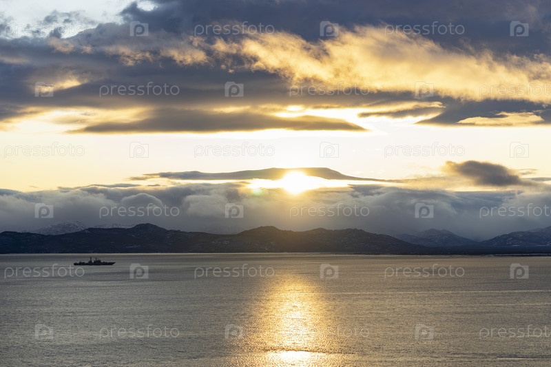 Морской пейзаж с силуэтами военных кораблей на закате. Камчатка