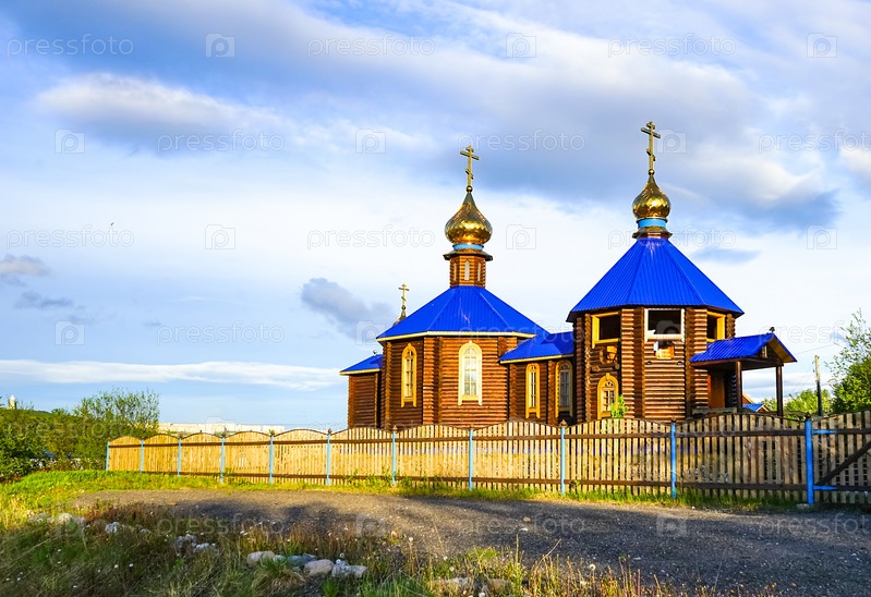 Деревянная часовня с голубой крышей на берегу Кольского залива
