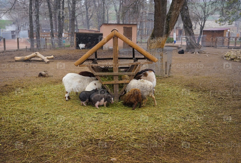 Свиньи и овцы в загоне едят сено в плохую погоду