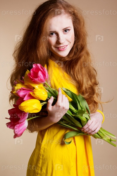 Красивая рыжая девушка с тюльпанами