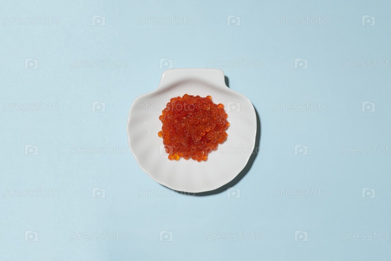 Фарфоровая тарелка с красной икрой на синем фоне