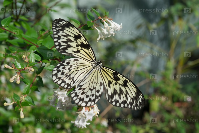 Бабочка сидит на зеленых ветвях в теплице