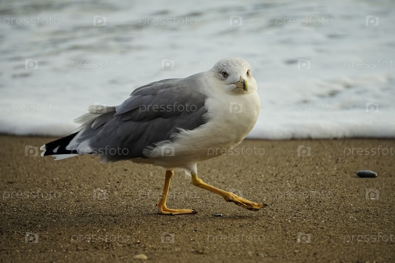 Портрет большой чайки на желтом песке