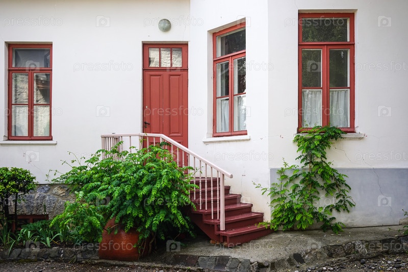 Белое здание с красной крышей, дом или коттедж. Дача Чехова. Ялта, Крым