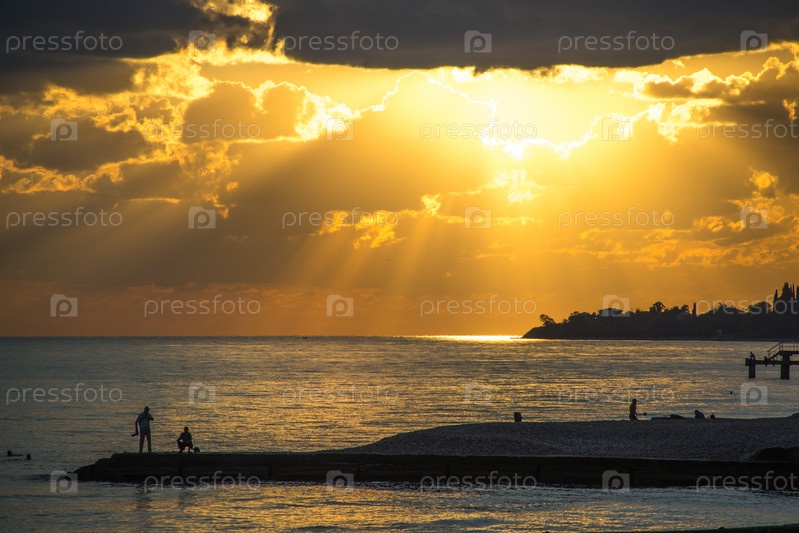 Береговая линия с пляжами, волноломами и силуэтом людей на фоне яркого заката