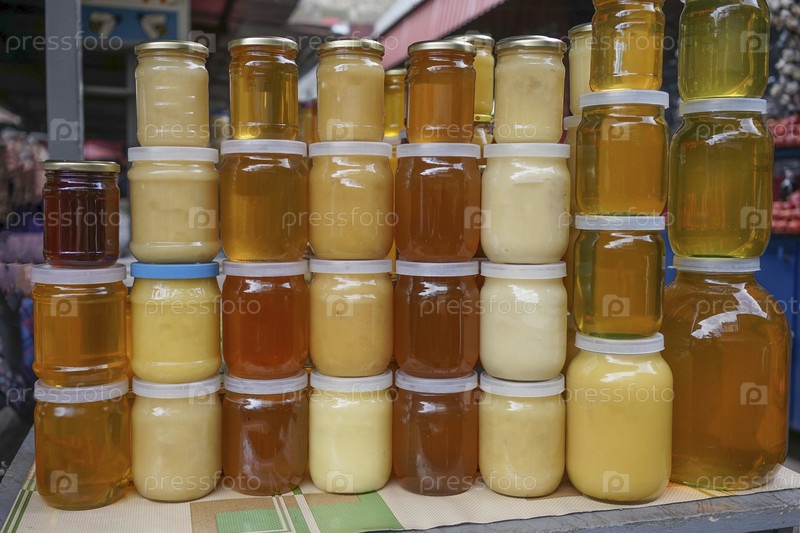 Мед разного цвета в банках на прилавке для продажи