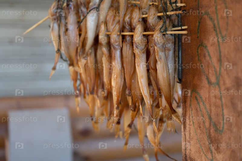 Куча копченой голомянки на размытом фоне