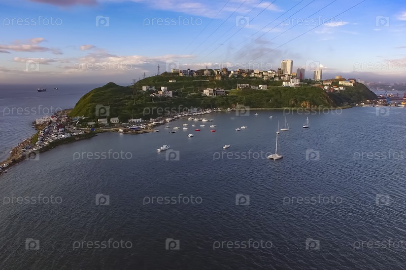 Владивосток, Приморский край - 26 августа 2018 г.: Морской пейзаж с видом на мыс Эгершельд и лодки