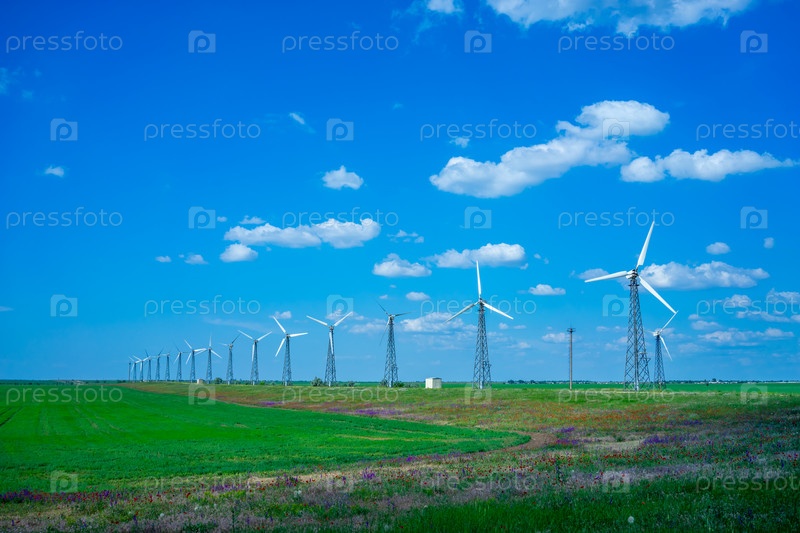 Пейзаж с ветряными электростанциями на фоне зеленого поля