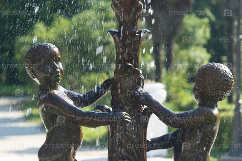 Сочи, Россия-24 июня 2018 г.: Скульптуры бронзовых мальчиков в каплях воды. Фонтан в парке южных культур
