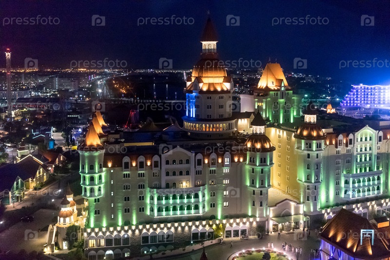 Сочи, Россия-07 января 2018: Городской пейзаж с видом на освещенный цветными огнями отель-герой