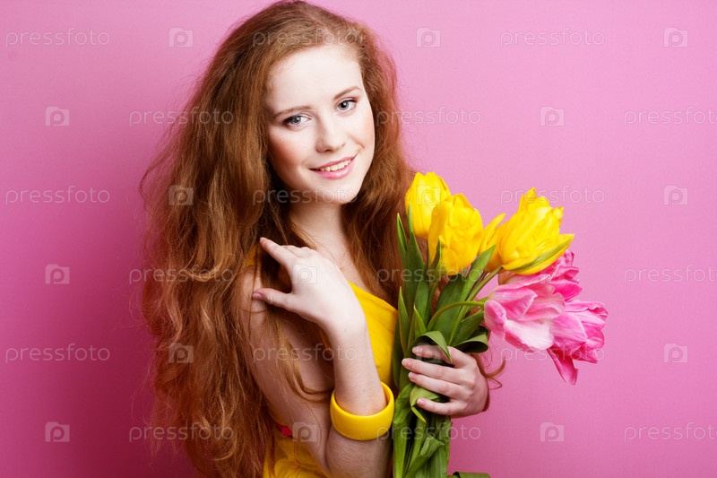 Красивая рыжая девушка с тюльпанами