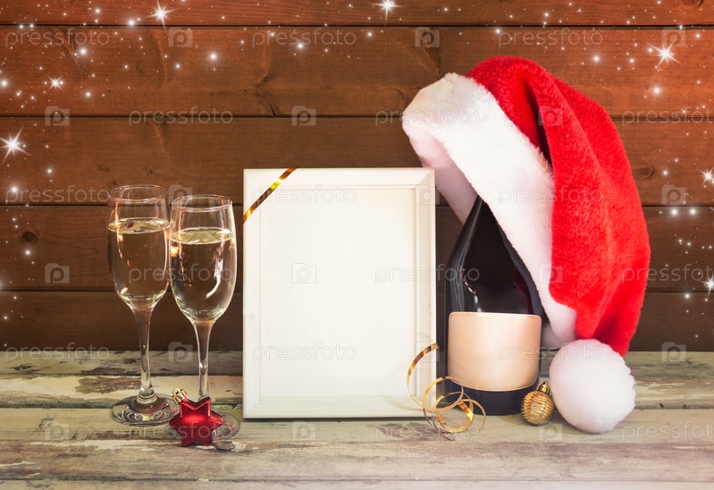 Рамка, бокалы для шампанского, бутылка шампанского в шляпе Санты и рождественские украшения на старом деревянном столе. Празднование Рождества и Нового года