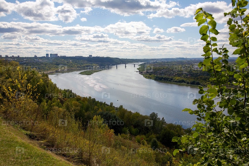 Осенний вид на реку и мост через Оку с высокого холма в центральном парке Швейцария, Нижний Новгород