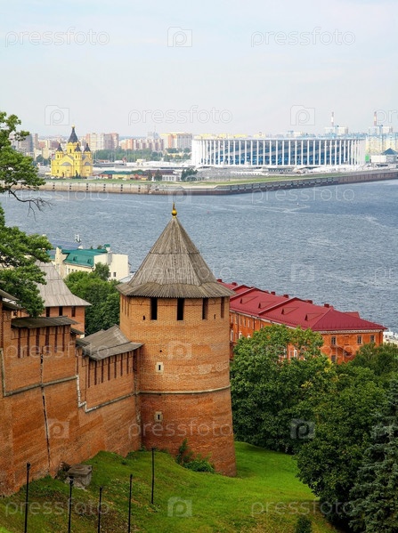 Борисоглебская башня Нижегородского кремля. Вид на Окскую набережную на Стрелке с собором Александра Невского и новым стадионом. Место слияние рек Оки и Волги