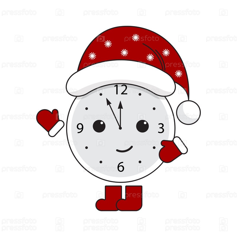 Мультяшный будильник в новогоднем костюме на белом фоне. Векторная иллюстрация