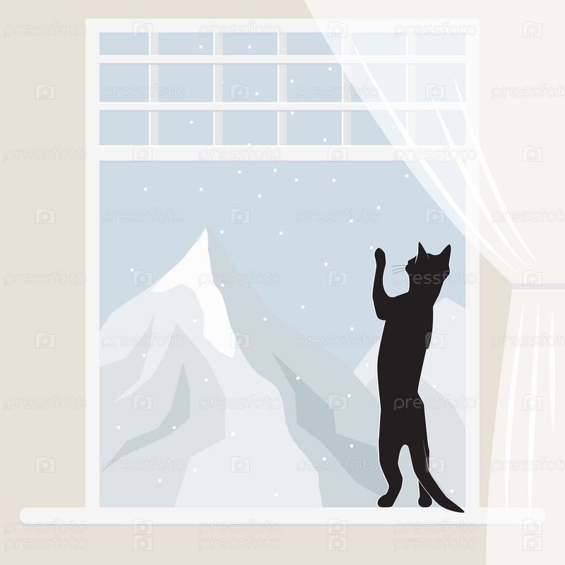 Черный котенок сидит на окне и ловит снежинки на фоне гор. Векторная иллюстрация